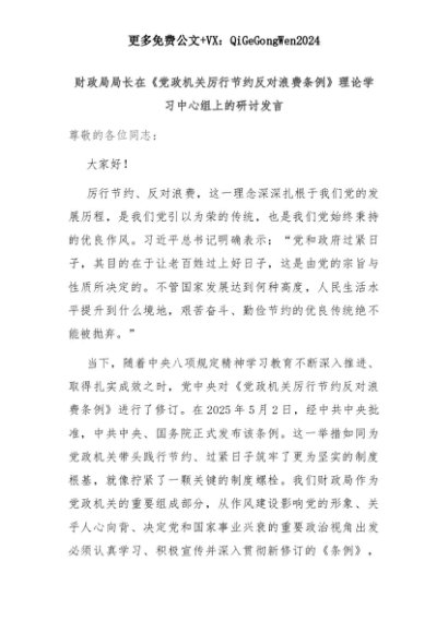【七哥公文】2025年:财政局局长在《党政机关厉行节约反对浪费条例》理论学习中心组上的研讨发言+更多免费公文+VX:QiGeGongWen2024+更多免费公文+VX:QiGeGongWen2024