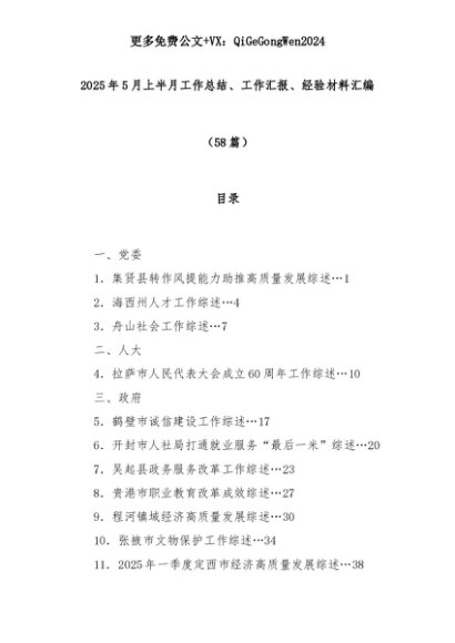 【七哥公文】2025年:(58篇)2025年5月上半月工作总结、工作汇报、经验材料汇编+更多免费公文+VX:QiGeGongWen2024+更多免费公文+VX:QiGeGongWen2024