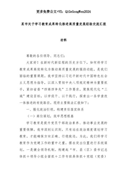【七哥公文】2025年:某市关于学习教育成果转化推进高质量发展经验交流汇报材料+更多免费公文+VX:QiGeGongWen2024+更多免费公文+VX:QiGeGongWen2024