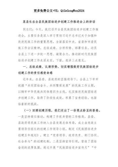 【七哥公文】2025年:某县长在全县民族团结进步创建工作推进会上的讲话+更多免费公文+VX:QiGeGongWen2024+更多免费公文+VX:QiGeGongWen2024