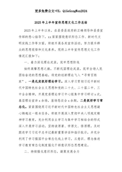 【七哥公文】2025年:2025年上半年宣传思想文化工作总结+更多免费公文+VX:QiGeGongWen2024+更多免费公文+VX:QiGeGongWen2024