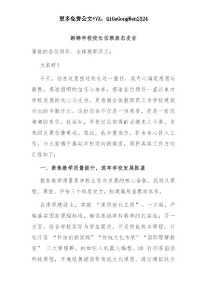 【七哥公文】2025年:新聘学校校长任职表态发言+更多免费公文+VX:QiGeGongWen2024+更多免费公文+VX:QiGeGongWen2024