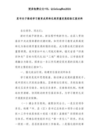 【七哥公文】2025年:某市关于推进学习教育成果转化高质量发展经验汇报材料+更多免费公文+VX:QiGeGongWen2024+更多免费公文+VX:QiGeGongWen2024