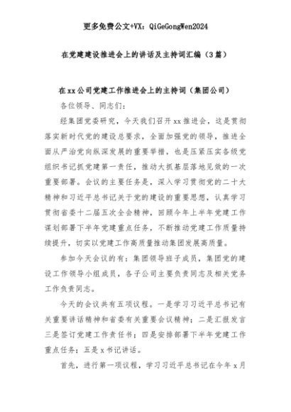 【七哥公文】2025年:(3篇)在党建建设推进会上的讲话及主持词汇编+更多免费公文+VX:QiGeGongWen2024+更多免费公文+VX:QiGeGongWen2024