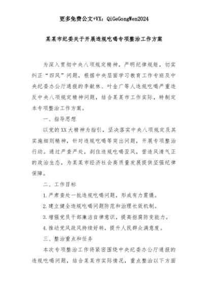 【七哥公文】2025年:某某市纪委关于开展违规吃喝专项整治工作方案+更多免费公文+VX:QiGeGongWen2024+更多免费公文+VX:QiGeGongWen2024