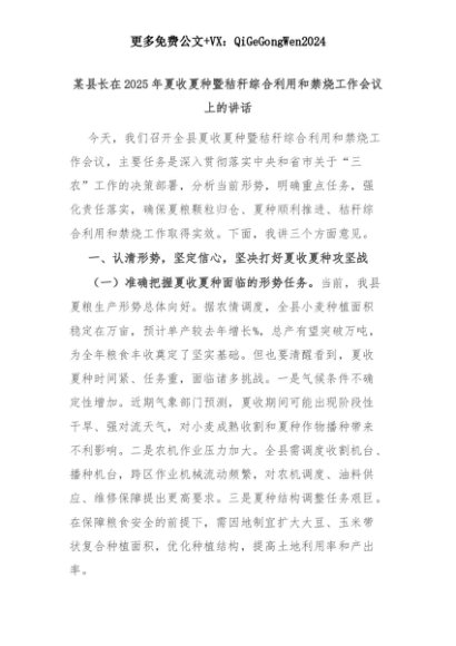 【七哥公文】2025年:某县长在2025年夏收夏种暨秸秆综合利用和禁烧工作会议上的讲话+更多免费公文+VX:QiGeGongWen2024+更多免费公文+VX:QiGeGongWen2024