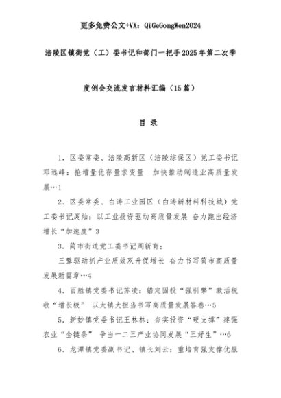 【七哥公文】2025年:(15篇)涪陵区镇街党(工)委书记和部门一把手2025年第二次季度例会交流发言材料汇编+更多免费公文+VX:QiGeGongWen2024+更多免费公文+VX:QiGeGongWen2024