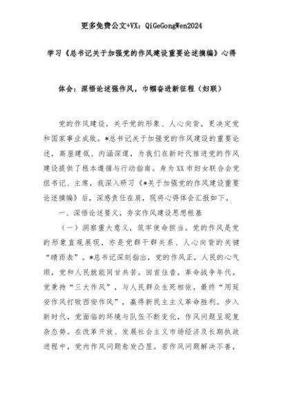 【七哥公文】2025年:学习《总书记关于加强党的作风建设重要论述摘编》心得体会:深悟论述强作风,巾帼奋进新征程(妇联)+更多免费公文+VX:QiGeGongWen2024+更多免费公文+VX:QiGeGongWen2024