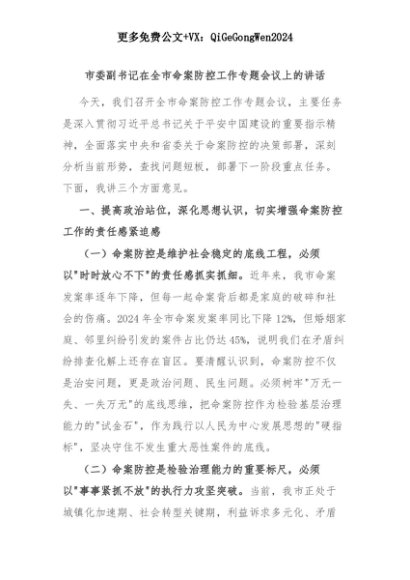 【七哥公文】2025年:市委副书记在全市命案防控工作专题会议上的讲话+更多免费公文+VX:QiGeGongWen2024+更多免费公文+VX:QiGeGongWen2024