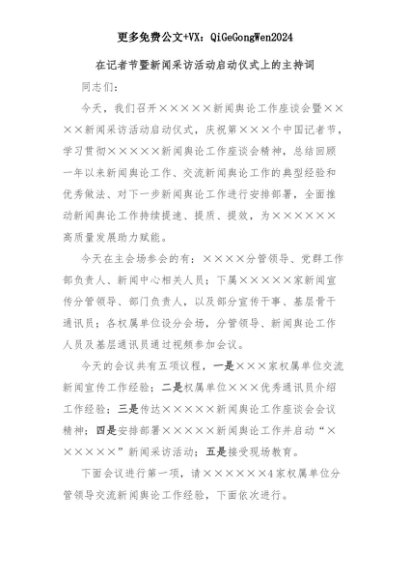 【七哥公文】2025年:在记者节暨新闻采访活动启动仪式上的主持词+更多免费公文+VX:QiGeGongWen2024+更多免费公文+VX:QiGeGongWen2024
