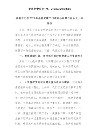 【七哥公文】2025年:县委书记在2025年县委党建工作领导小组第二次会议上的讲话+更多免费公文+VX:QiGeGongWen2024+更多免费公文+VX:QiGeGongWen2024
