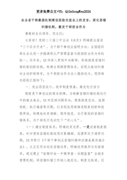 【七哥公文】2025年:在全省干部激励机制建设经验交流会上的发言:深化容错纠错机制,激发干部担当作为+更多免费公文+VX:QiGeGongWen2024+更多免费公文+VX:QiGeGongWen2024