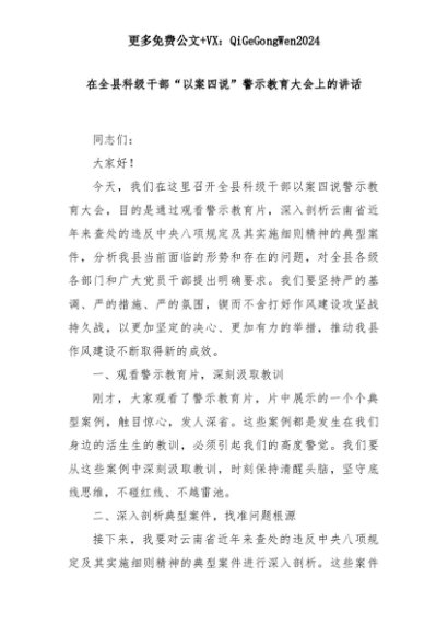 【七哥公文】2025年:在全县科级干部“以案四说”警示教育大会上的讲话+更多免费公文+VX:QiGeGongWen2024+更多免费公文+VX:QiGeGongWen2024
