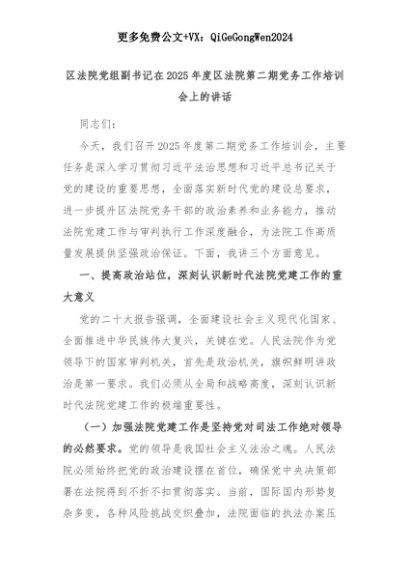 【七哥公文】2025年:区法院党组副书记在2025年度区法院第二期党务工作培训会上的讲话+更多免费公文+VX:QiGeGongWen2024+更多免费公文+VX:QiGeGongWen2024