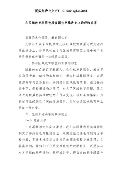 【七哥公文】2025年:在区域教育联盟优质资源共享推进会上的经验分享+更多免费公文+VX:QiGeGongWen2024+更多免费公文+VX:QiGeGongWen2024