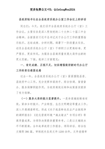 【七哥公文】2025年:县政府秘书长在全县政府系统办公室工作会议上的讲话+更多免费公文+VX:QiGeGongWen2024+更多免费公文+VX:QiGeGongWen2024