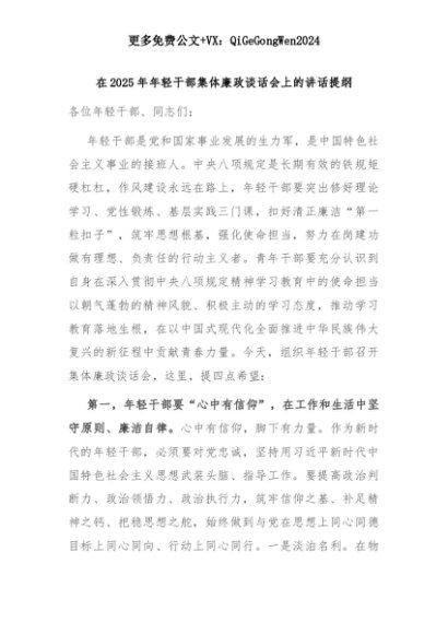 【七哥公文】2025年:在2025年年轻干部集体廉政谈话会上的讲话提纲+更多免费公文+VX:QiGeGongWen2024+更多免费公文+VX:QiGeGongWen2024