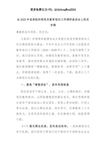 【七哥公文】2025年:在2025年省委组织部党员教育培训工作调研座谈会上的发言稿+更多免费公文+VX:QiGeGongWen2024+更多免费公文+VX:QiGeGongWen2024
