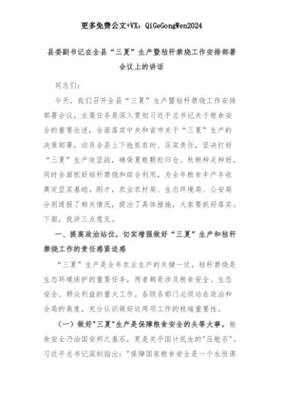 【七哥公文】2025年:县委副书记在全县“三夏”生产暨秸秆禁烧工作安排部署会议上的讲话+更多免费公文+VX:QiGeGongWen2024+更多免费公文+VX:QiGeGongWen2024