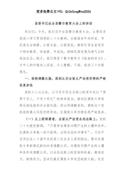 【七哥公文】2025年:县委书记在全县警示教育大会上的讲话+更多免费公文+VX:QiGeGongWen2024+更多免费公文+VX:QiGeGongWen2024