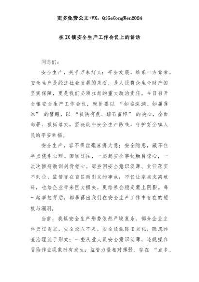 【七哥公文】2025年:在XX镇安全生产工作会议上的讲话+更多免费公文+VX:QiGeGongWen2024+更多免费公文+VX:QiGeGongWen2024