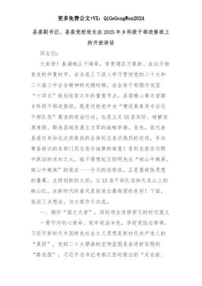 【七哥公文】2025年:县委副书记、县委党校校长在2025年乡科级干部进修班上的开班讲话+更多免费公文+VX:QiGeGongWen2024+更多免费公文+VX:QiGeGongWen2024