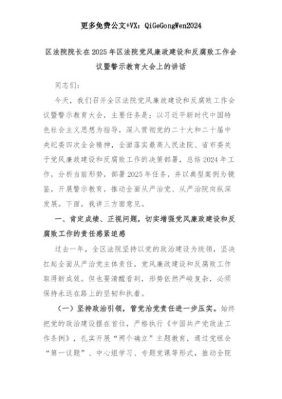 【七哥公文】2025年:区法院院长在2025年区法院党风廉政建设和反腐败工作会议暨警示教育大会上的讲话+更多免费公文+VX:QiGeGongWen2024+更多免费公文+VX:QiGeGongWen2024