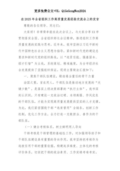 【七哥公文】2025年:在2025年全省组织工作高质量发展经验交流会上的发言+更多免费公文+VX:QiGeGongWen2024+更多免费公文+VX:QiGeGongWen2024