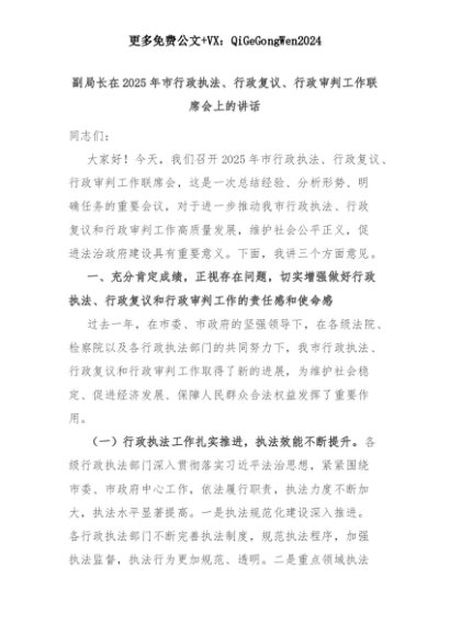【七哥公文】2025年:副局长在2025年市行政执法、行政复议、行政审判工作联席会上的讲话+更多免费公文+VX:QiGeGongWen2024+更多免费公文+VX:QiGeGongWen2024