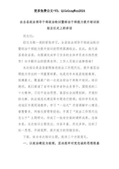 【七哥公文】2025年:在全县政法领导干部政治轮训暨综治干部能力提升培训班结业仪式上的讲话+更多免费公文+VX:QiGeGongWen2024+更多免费公文+VX:QiGeGongWen2024