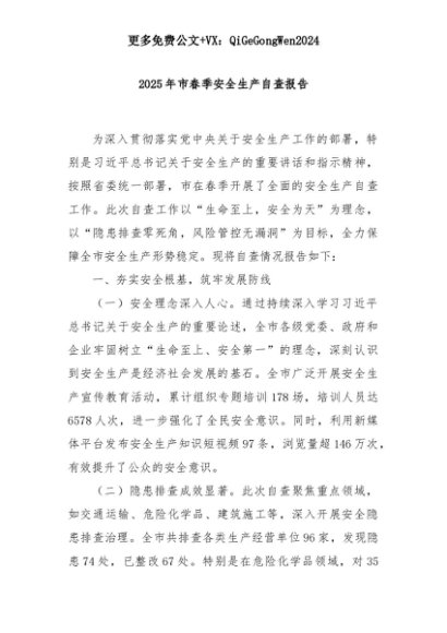 【七哥公文】2025年:2025年市春季安全生产自查报告+更多免费公文+VX:QiGeGongWen2024+更多免费公文+VX:QiGeGongWen2024
