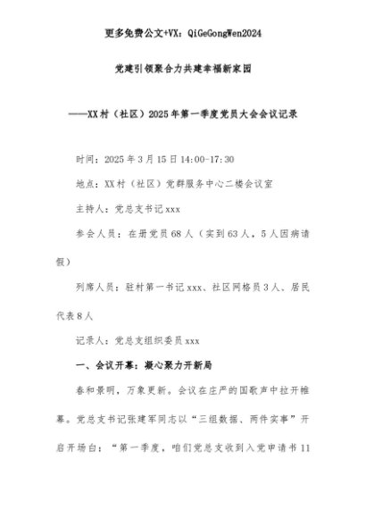 【七哥公文】2025年:2.XX村(社区)2025年第一季度党员大会会议记录+更多免费公文+VX:QiGeGongWen2024+更多免费公文+VX:QiGeGongWen2024