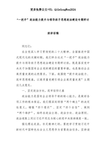 【七哥公文】2025年:“一把手”政治能力提升与领导班子思想政治建设专题研讨班讲话稿+更多免费公文+VX:QiGeGongWen2024+更多免费公文+VX:QiGeGongWen2024