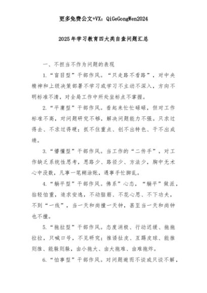 【七哥公文】2025年:2025年学习教育四大类自查问题汇总+更多免费公文+VX:QiGeGongWen2024+更多免费公文+VX:QiGeGongWen2024