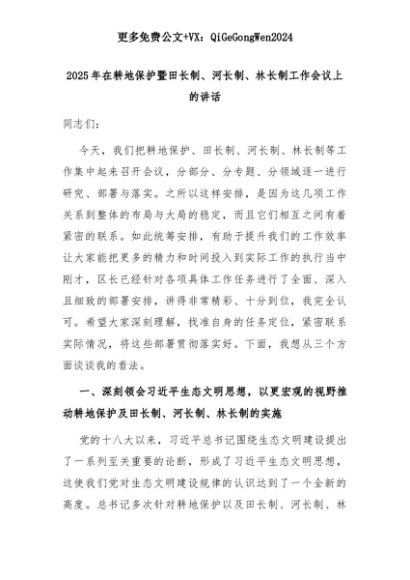 【七哥公文】2025年:2025年在耕地保护暨田长制、河长制、林长制工作会议上的讲话+更多免费公文+VX:QiGeGongWen2024+更多免费公文+VX:QiGeGongWen2024