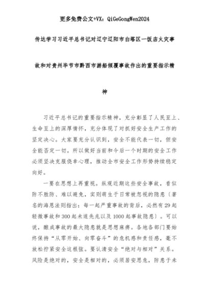 【七哥公文】2025年:传达学习习近平总书记对辽宁辽阳市白塔区一饭店火灾事故和对贵州毕节市黔西市游船倾覆事故作出的重要指示精神+更多免费公文+VX:QiGeGongWen2024+更多免费公文+VX:QiGeGongWen2024