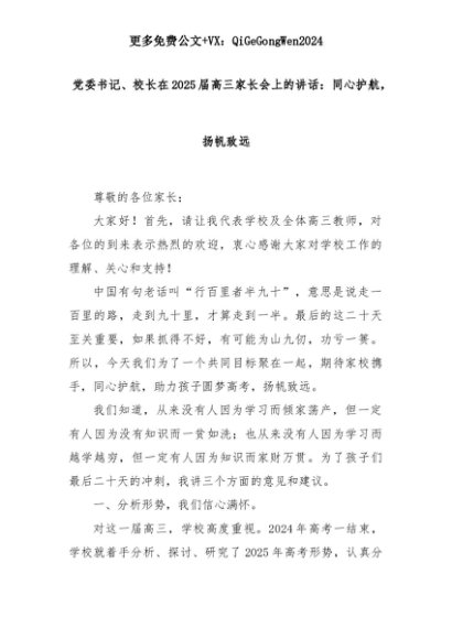 【七哥公文】2025年:党委书记、校长在2025届高三家长会上的讲话:同心护航,扬帆致远+更多免费公文+VX:QiGeGongWen2024+更多免费公文+VX:QiGeGongWen2024