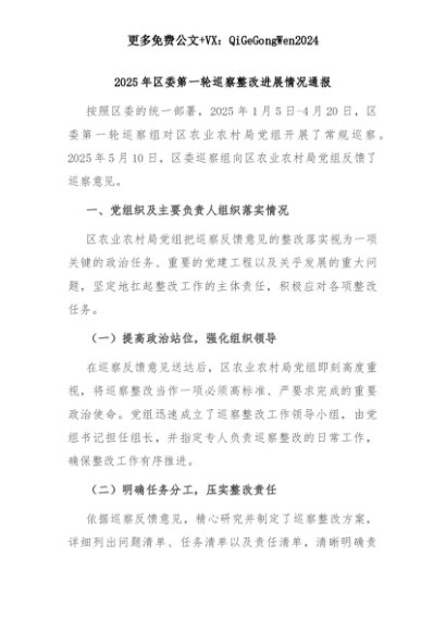 【七哥公文】2025年:2025年区委第一轮巡察整改进展情况通报+更多免费公文+VX:QiGeGongWen2024+更多免费公文+VX:QiGeGongWen2024
