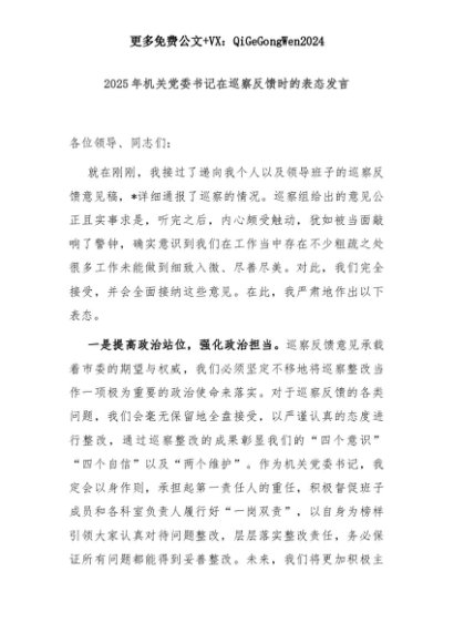 【七哥公文】2025年:2025年机关党委书记在巡察反馈时的表态发言+更多免费公文+VX:QiGeGongWen2024+更多免费公文+VX:QiGeGongWen2024