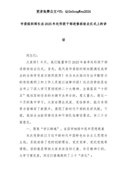 【七哥公文】2025年:市委组织部长在2025年处科级干部进修班结业仪式上的讲话+更多免费公文+VX:QiGeGongWen2024+更多免费公文+VX:QiGeGongWen2024