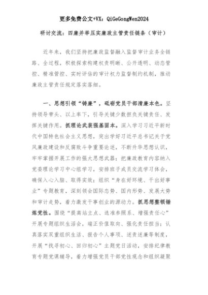 【七哥公文】2025年:研讨交流:四廉并举压实廉政主管责任链条(审计)+更多免费公文+VX:QiGeGongWen2024+更多免费公文+VX:QiGeGongWen2024