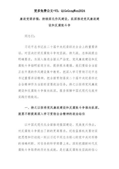 【七哥公文】2025年:廉政党课讲稿:持续深化作风建设,纵深推进党风廉政建设和反腐败斗争+更多免费公文+VX:QiGeGongWen2024+更多免费公文+VX:QiGeGongWen2024