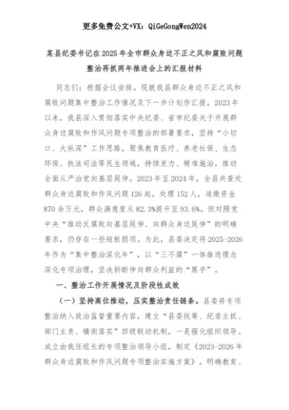 【七哥公文】2025年:某县纪委书记在2025年全市群众身边不正之风和腐败问题整治再抓两年推进会上的汇报材料+更多免费公文+VX:QiGeGongWen2024+更多免费公文+VX:QiGeGongWen2024