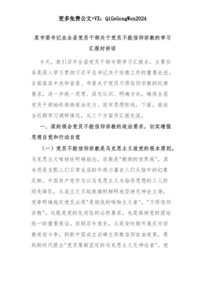 【七哥公文】2025年:某市委书记在全县党员干部关于党员不能信仰宗教的学习汇报时讲话+更多免费公文+VX:QiGeGongWen2024+更多免费公文+VX:QiGeGongWen2024