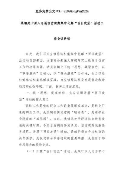 【七哥公文】2025年:某镇关于深入开展信访积案集中化解“百日攻坚”活动工作会议讲话+更多免费公文+VX:QiGeGongWen2024+更多免费公文+VX:QiGeGongWen2024