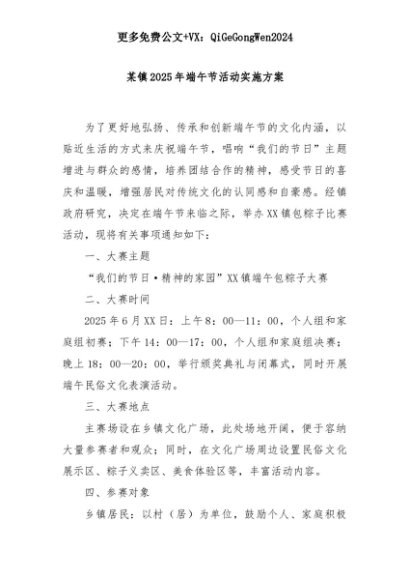 【七哥公文】2025年:某镇2025年端午节活动实施方案+更多免费公文+VX:QiGeGongWen2024+更多免费公文+VX:QiGeGongWen2024
