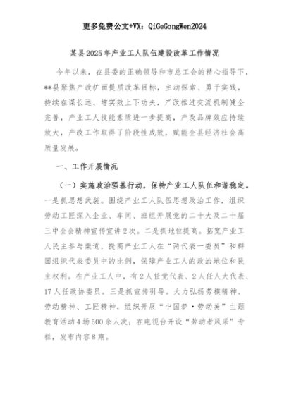 【七哥公文】2025年:某县2025年产业工人队伍建设改革工作情况+更多免费公文+VX:QiGeGongWen2024+更多免费公文+VX:QiGeGongWen2024