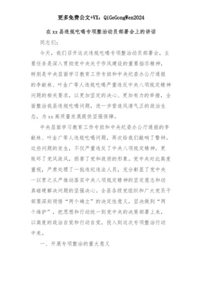 【七哥公文】2025年:在xx县违规吃喝专项整治动员部署会上的讲话+更多免费公文+VX:QiGeGongWen2024+更多免费公文+VX:QiGeGongWen2024