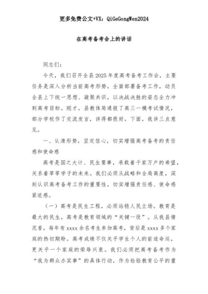 【七哥公文】2025年:在高考备考会上的讲话+更多免费公文+VX:QiGeGongWen2024+更多免费公文+VX:QiGeGongWen2024