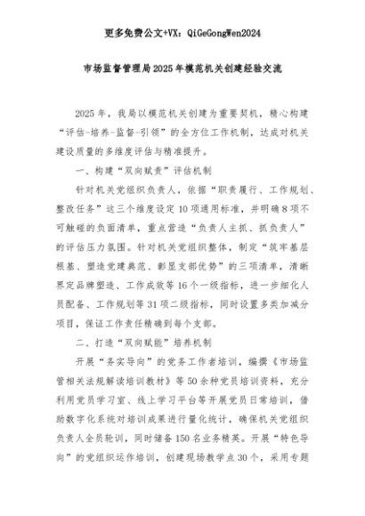 【七哥公文】2025年:市场监督管理局2025年模范机关创建经验交流+更多免费公文+VX:QiGeGongWen2024+更多免费公文+VX:QiGeGongWen2024